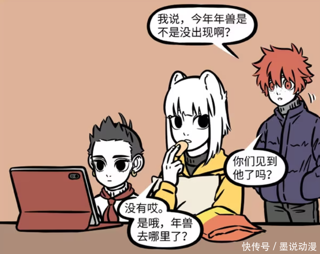 《非人哉》漫画版,本以为年兽知道自己是寂寂无名的小妖怪之后,不会再度出现。没想到它还是每年都会登场几话。这一次九月和哪吒在过年期间追剧闪牛,红孩儿没有见到年兽的身影。不过他们都不在意年兽是否出现,毕竟它不在还安静一些。没想到年兽是离家出走,要让其他人重视。最终是有人报警,警察来小区抓年兽。
